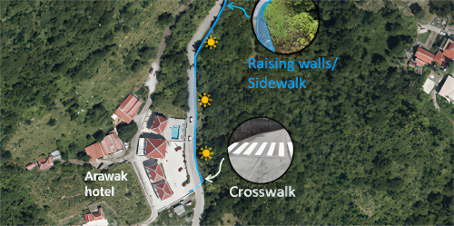 This road section, including the area near Arawak Hotel is heavily used by both vehicles and pedestrians. Planned safety measures include the installation of street lighting, sidewalks, pedestrian crossings, reflective elements on safety walls, and speed bumps.