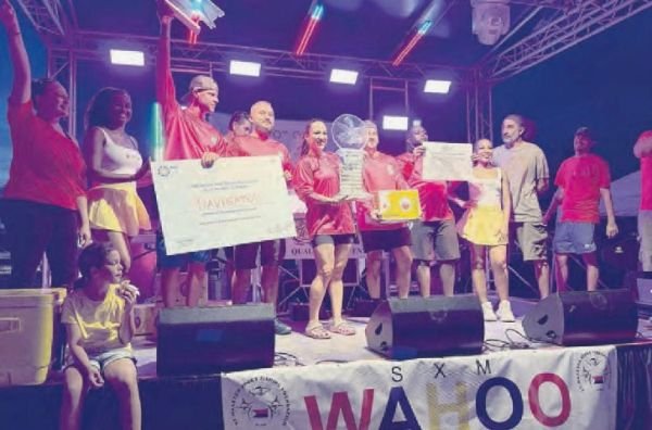 The team from “Navigator” celebrate on stage after winning the 14th Annual SXM Wahoo Fishing tournament Saturday night. (Robert Luckock photo)